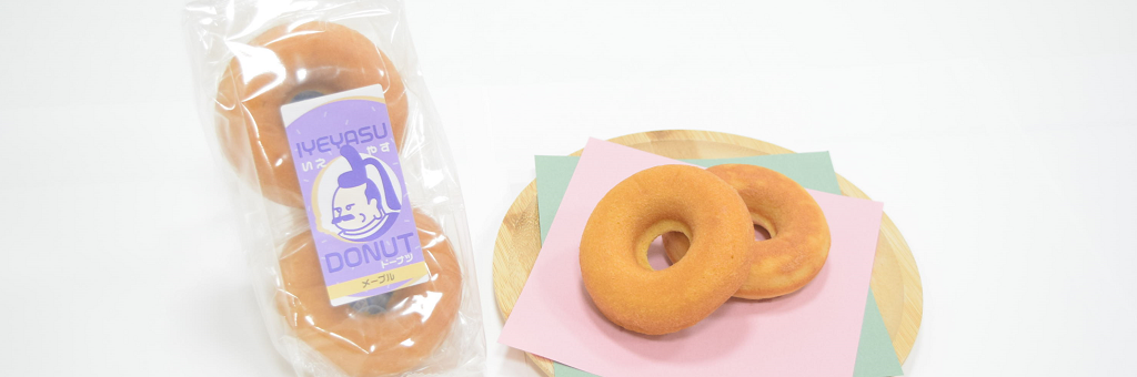 当時は珍しかった「眼器」と言われたまん丸眼鏡を晩年愛用していた家康公。自慢のメープル味のしっとりドーナツをその眼鏡の様に2つ並べてパッケージしました。
