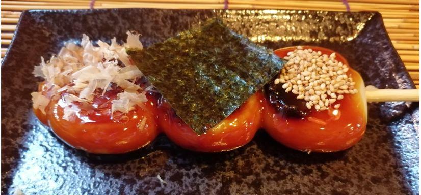徳川家康公に仕えた服部半蔵正成をイメージした和風スイーツ。ふっくら焼き上げたお餅に地元産たまりを使用したみたらしダレに漬け「鰹・海苔・ごま」をのせたお餅です。
