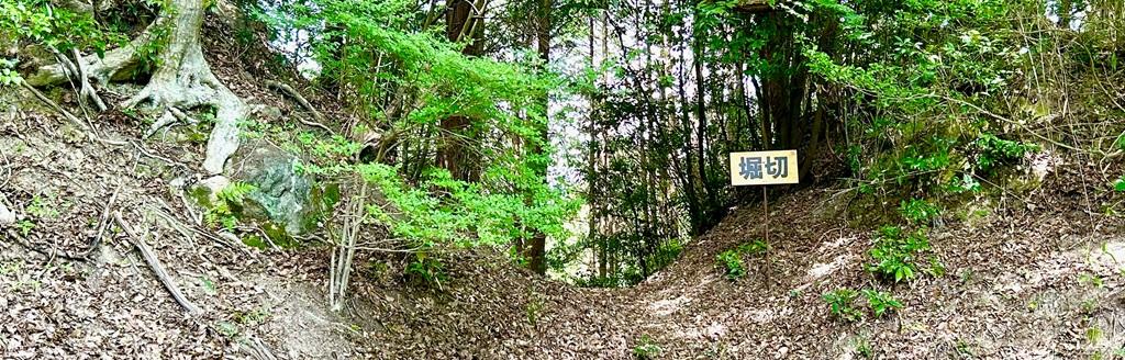 横堀は主郭裾をめぐり、さらに堀切へとつながり、堀切の先は竪堀で遮断されます。