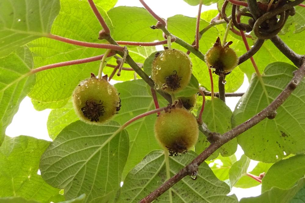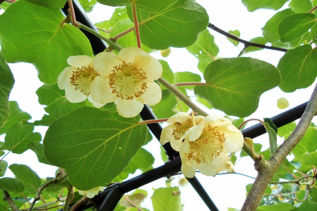 花の見頃は5〜6月。白い大きな花を下向きに付けます。元は中国原産で、ニュージーランドで品種改良されたものが食用になっていて、野生の「サルナシ」がキウイの原種です。2017年に初収穫ができましたが、わずか3つ。しかも、石ころみたいにカチカチで、追熟なしでは食べられませんでした。今後に期待です。