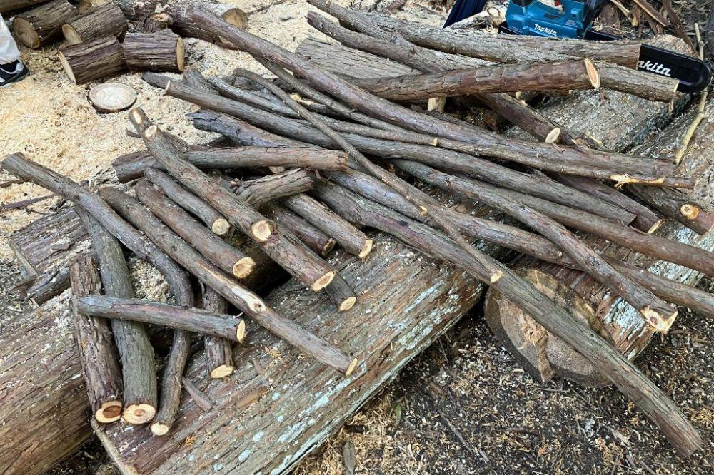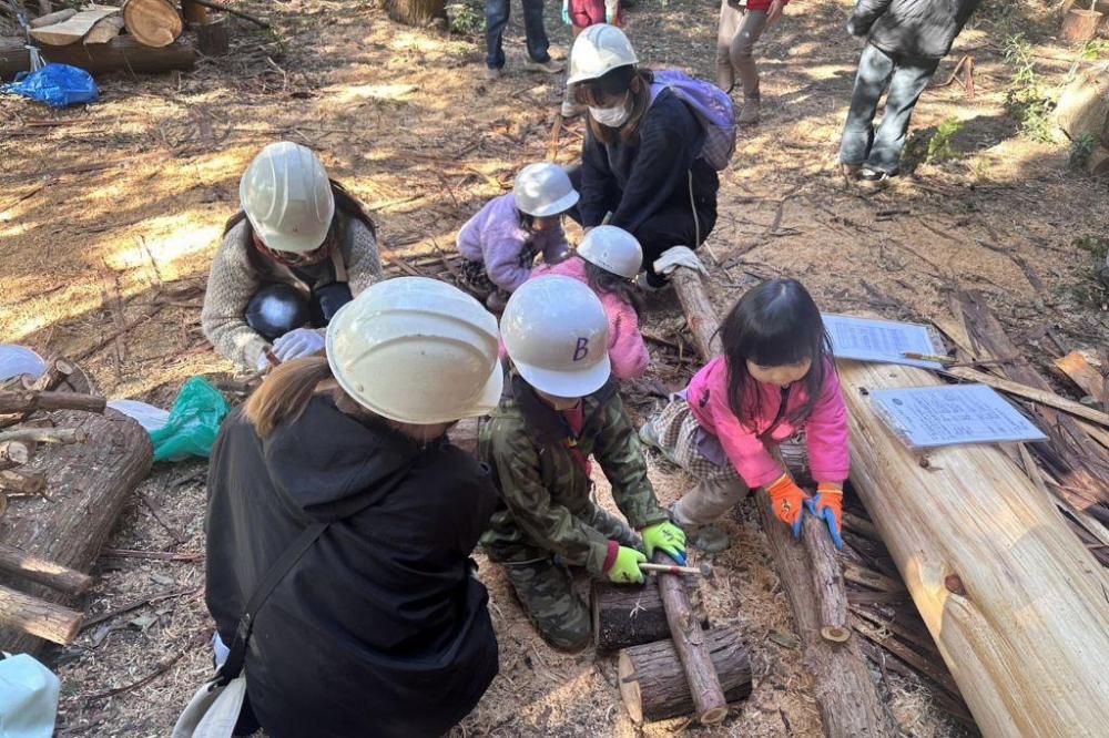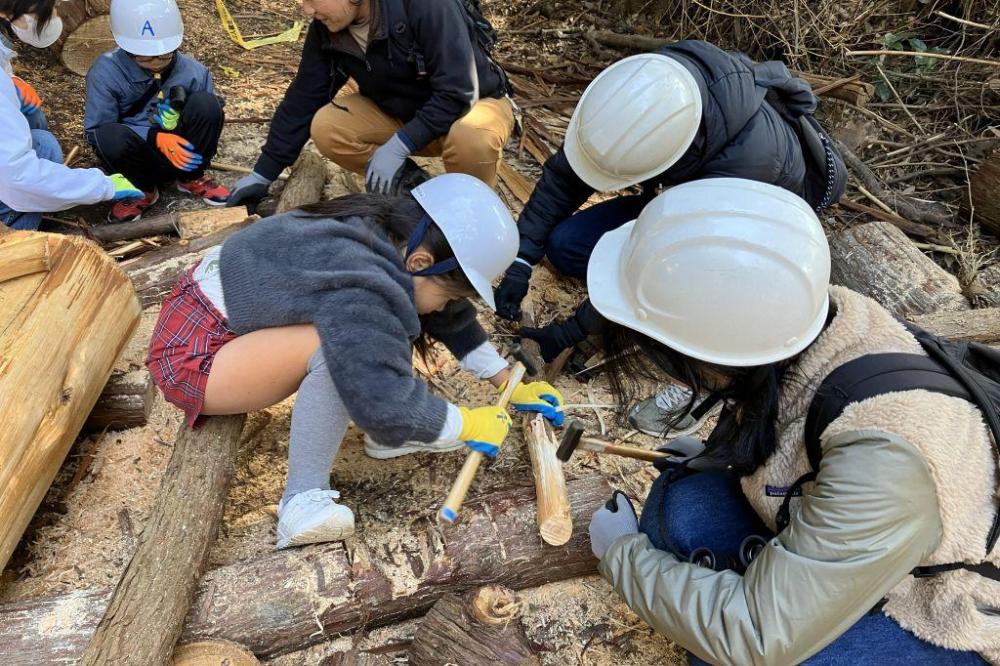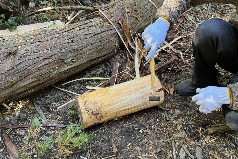 伐採してあるヒノキの中から自分の好きなものを選んで、かなづちで皮をたたいていきます。