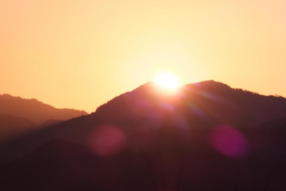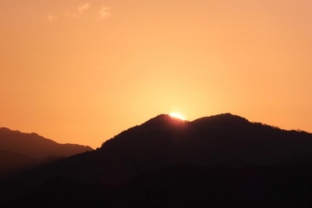 そして7時4分頃、山の端に太陽の頭が覗き、そこから一気に勢いよく上昇、眩い光と共にその全貌を現しました。