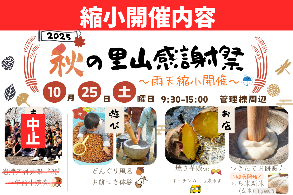 2025年「秋の里山感謝祭」縮小開催のご案内 雨の予報ですが、縮小開催します!ご来場をお待ちしております。 明日はあいにくの小雨ではありますが、「2025秋の里山感謝祭」を縮小開催で決行いたします。 画像1枚目の縮小開催のお知らせ →公開していた開催内容の変更点 画像2枚目の縮小開催内容 →「2025秋の里山感謝祭」の雨天バージョンの内容のお知らせ 中止のプログラムもありますが、スタッフ一同ご来場をお待ちしております! 詳細は以下のリンクからチラシをご確認ください。 イベント情報はこちら ツイート