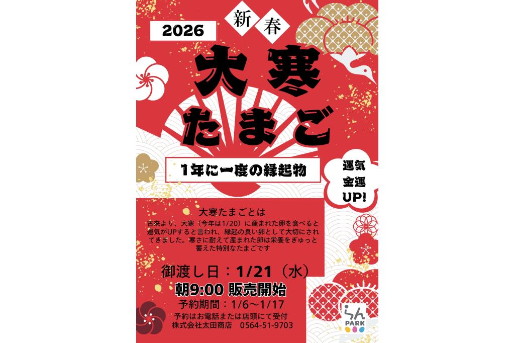 太田商店にて、1年のうち最も寒さが厳しい時期「大寒(だいかん)」に産まれた卵「大寒卵(だいかんたまご)」の予約が開始されました!
