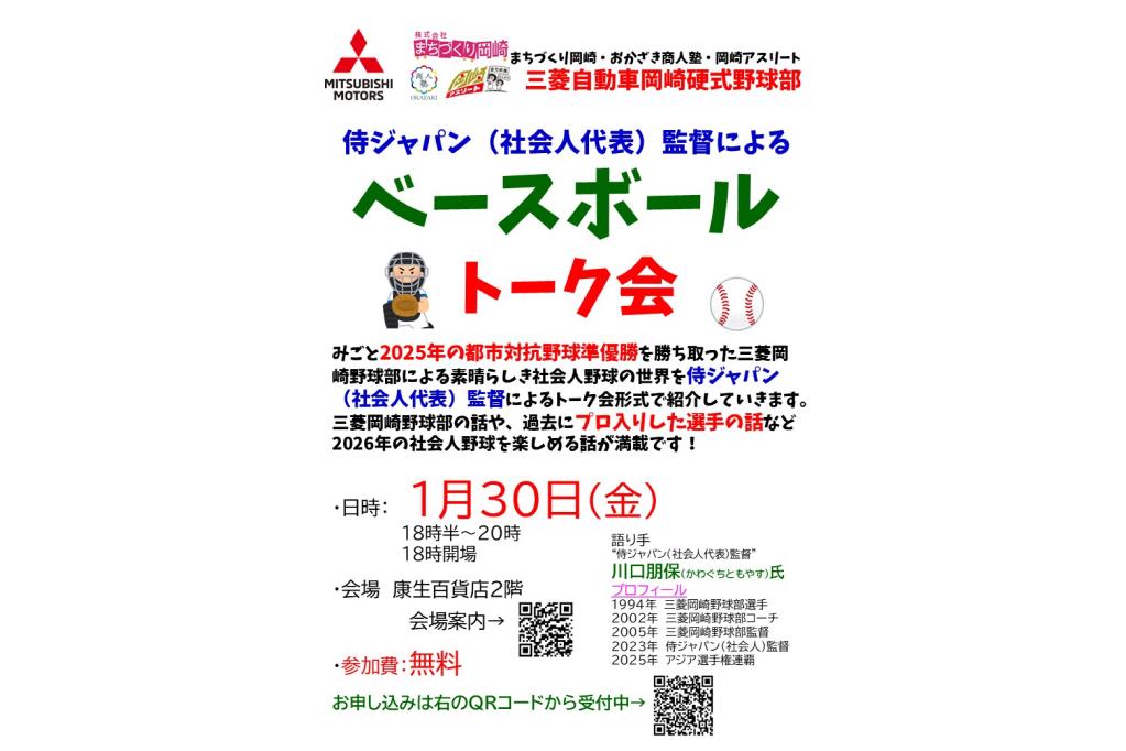 みごと2025年の都市対抗野球準優勝を勝ち取った三菱岡崎野球部で、選手・コーチ・監督として活躍した、侍ジャパン(社会人代表)監督・川口朋保氏によるトーク会が行われます!