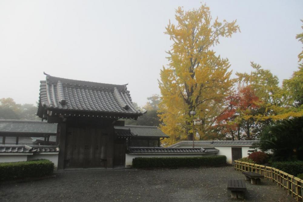 今朝は霧がかかっております。茶室の紅葉のピークはもう間もなくです。