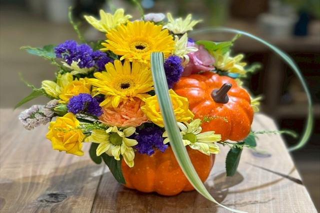 カボチャの器に、秋の花をアレンジしたフラワーアレンジメントを作ります。