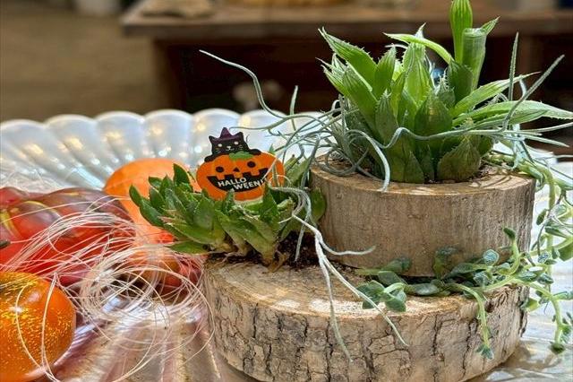 切り株風の器に様々な多肉植物を植えて、オリジナルの寄せ植え小鉢を作ります。
